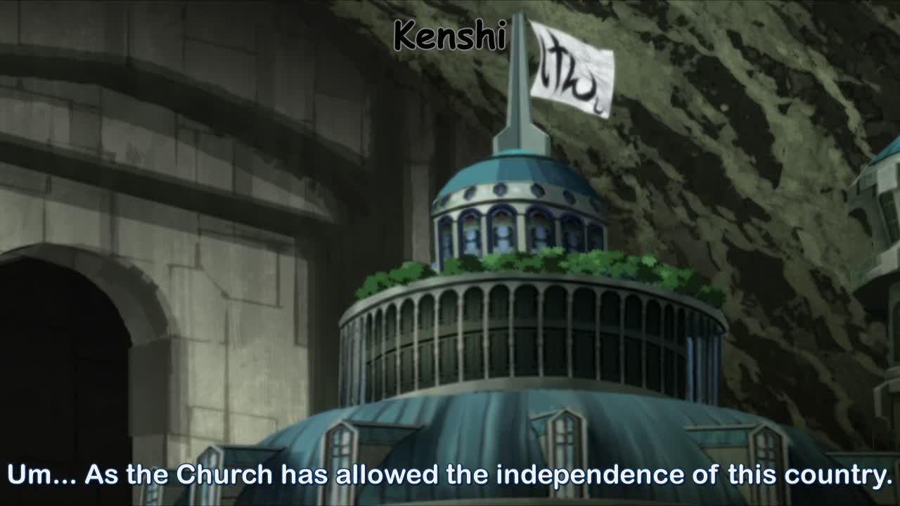 If I sigh any harder I’m going to collapse a lung, so let’s move on. The really disappointing thing about the show is that it does try some new things that are mired in the rest of this garbage. The mechs, for example, are kinda neat – They float around on Ahou energy, so they move almost soundlessly, and battle is a lot quieter and more graceful than you’d expect. The compressed-bullet thing is a cool idea. It seems like someone did put thought into the political and geographical side of the world (only to have it largely not matter). There’s also some thematic stuff – The church, for example, looks like this: