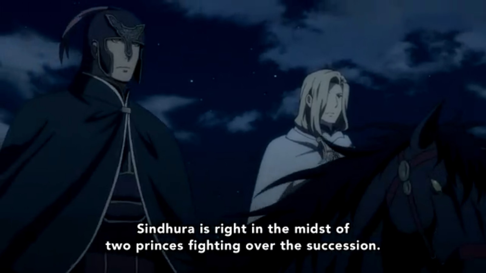 Just as Arslan had reached Peshawar Fortress, troops from Sindhura, a neighboring desert country, cross the border to attack. They are led by Rajendra, Second Prince of Sindhura, who seeks to obtain territory and glory to challenge his brother Gadevi’s claim to the throne. Leaving Arslan behind, Narsus, Elam, Alfreed, and Daryun lead a relatively small force (outnumbered five to one) against the invaders, but Narsus’ use of tactics and an understanding of the enemy’s weaknesses lead to the Sindhurans fleeing the battlefield with Rajendra captured. Clever negotiations lead to Rajendra entering into an alliance with Arslan in exchance for Arslan’s support putting Rajendra on the throne. Gadevi will not take this lying down, however…