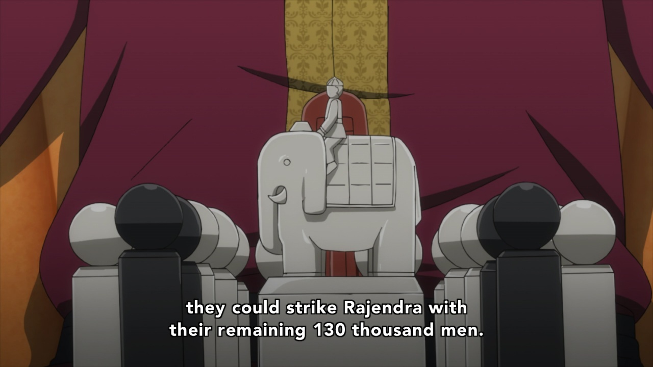 Having seized the fortress of Gujurat from the Sindhurans, Arslan faces a dilemma. The overwhelming numbers of the Sindhurans loyal to Prince Gadevi has split the Parsians off from their ally, Prince Rajendra. When faced with the might of Gadevi’s war elephants, Rajendra faces certain defeat, until the timely arrival of the Parsian cavalry saves them from total annihilation. With the war elephants dead and Gadevi’s army routed, an opportunity to end the conflict through a ritual duel arises, and Arslan will have to decide if he values his alliance with Rajendra enough to risk the life of one of his loyal companions.