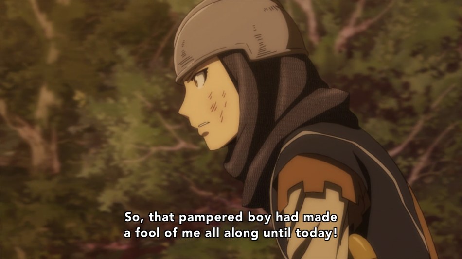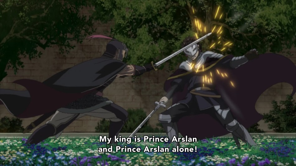 The confrontation between Etoile and Arslan should have been a linchpin of the series. In reality these two are two sides of the same coin. They are both good people trying to do right for their respective sides. This should have been a meeting of tragedy as two people who could be united under any other circumstances are forced to fight one another (potentially to death). Unfortunately, While watching this scene all we get is a time-waster (and an Arslan bacon-saver). Etoile freaks out and stabs Elam as he defends Arslan and then runs off due to being outnumbered.