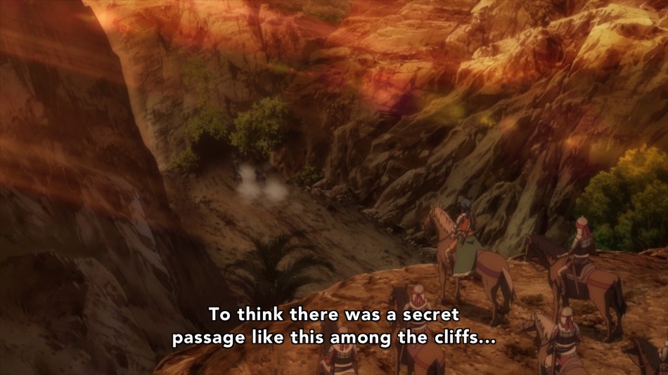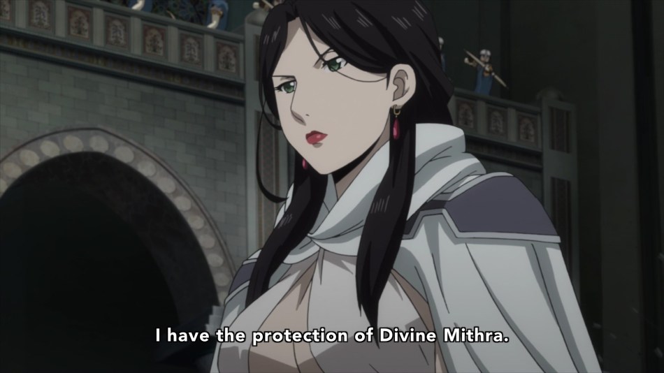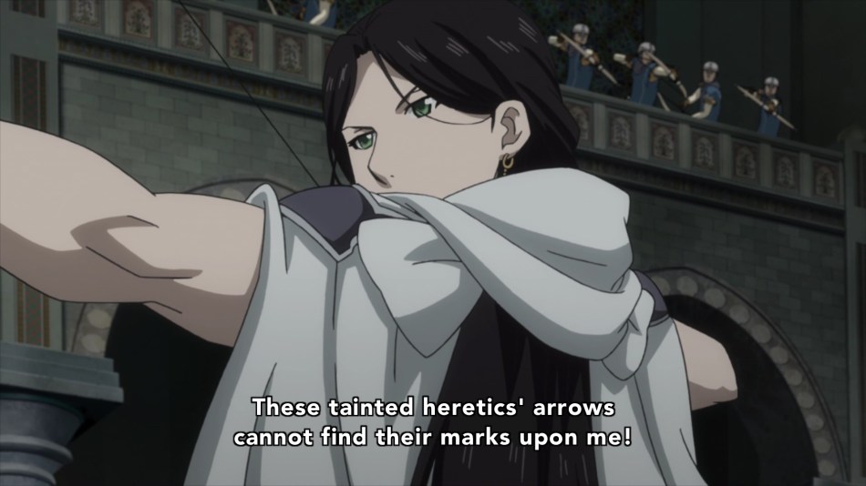 The problems for this episode begin here and if we had better understanding of the characters I would have had an easier time swallowing the events that follow. Nonsensical things begin to happen because the writers wanted to show off Arslan’s forces. In one scene Arslan and Daryun are nearly to Hermes, when they get caught in a room full of archers raining arrows from up above. Farangis straight up walks into the room and starts wrecking guys with her superior archery. She then turns to Arslan and states that she cannot be hit by the arrows of these heathens. She has “divine protection”. I almost threw my laptop in frustration.