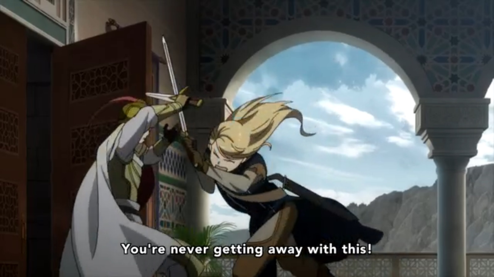 There’s one character that unifies all of my feelings on this episode, and on whom the majority of the episode is spent: Etoile. At the end of the previous episode, she burst in to Baracion’s chambers just in time to watch him fall to his death, apparently stabbed by Arslan. Indeed, the latter half of the previous episode was spent setting things up so this exact scene could happen, prompting Etoile to attack Arslan in a rage.