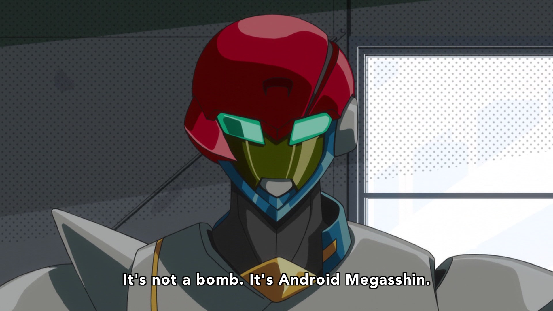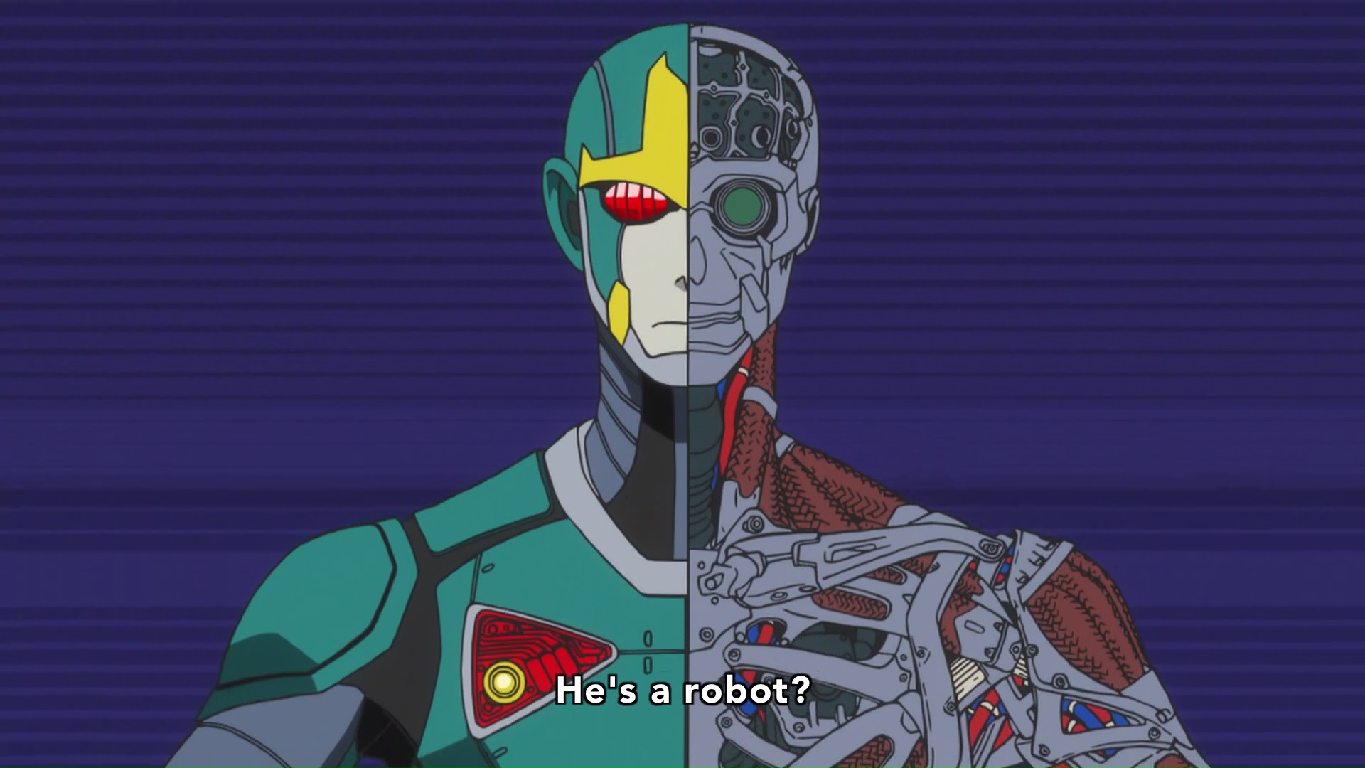 We are brought to a scene where a man is confined and riding in a car. He is broken out by the blonde man in the white coat. This man reveals himself to be the former Detective Shiba. He brings the man to a water treatment facility and opens a locker where he reveals that the Type A female robot Mieko survived. It turns out the man is the Type B robot!!! Shiba requests that they merge so that he can “wake up Japan because it has rotted away since the war”. Shiba seems to have lost his definition of justice after so many young men died in the war. Jirō appears to thwart Shiba’s plans but still allows the two robots to merge. They do so and form Android Megasshin, a robot with a profound sense of justice. The episode ends with Shiba duking it out in spectacular fashion with Megasshin and Jirō.
