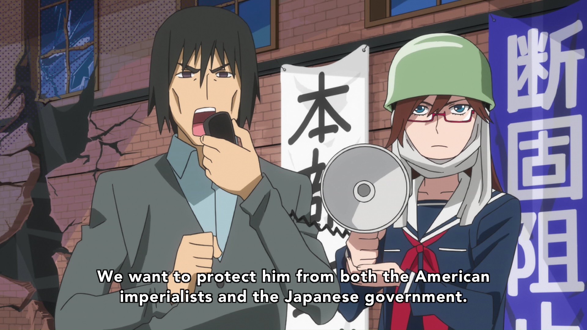 This is mostly due to the introduction of an entirely new sub-plot featuring an unnamed woman working for an “ad agency”, meeting with the also-previously-unknown government advisor Satomi. Satomi considers the Bureau an enemy, and appears to be working to shift public perception towards supporting kaiju and condemning superhumans. The still-unnamed woman helps stir up a group of student protestors who are supported by the members of Beastly Radio and the missing kaiju. It further complicates the already convoluted story from the previous episode and adds more characters and motivations to keep track of.