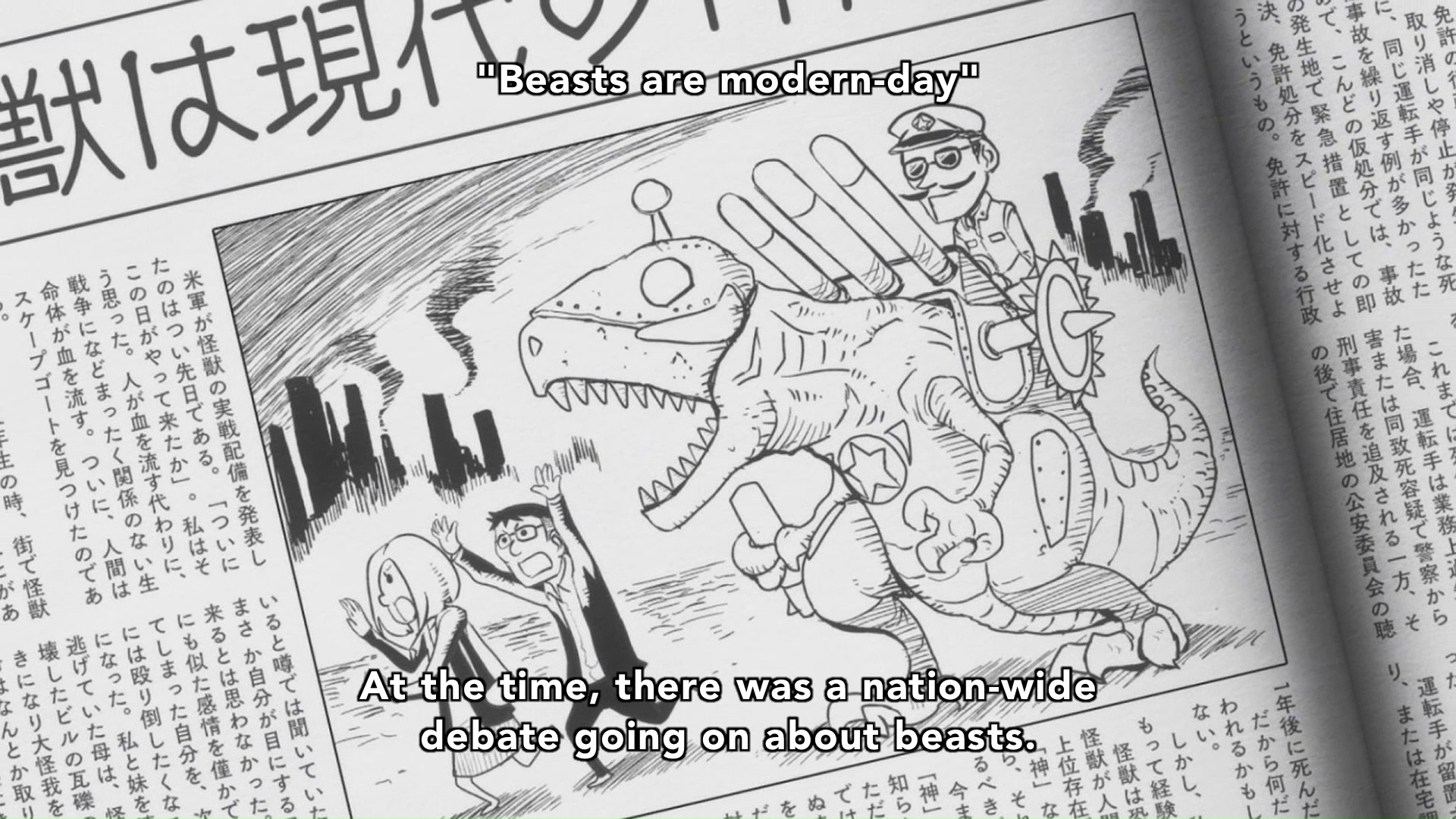 Public sentiment is mixed following the rash of kaiju battles as some view the beasts as victims and others see them as a grave threat. The US military has gone so far as to build up its own force of “domesticated” kaiju across the globe. We also learn that one of the military kaiju has supposedly died and been disposed of near Okinawa, but the Superhuman Bureau isn’t buying that story. They find the beast and the Beastly Radio group behind the earlier attacks working with a group of student protesters, and Jiro’s powers again threaten to cause havoc. While a full-blown disaster is averted, the protest marches on with the beast in tow, and the Bureau pulls out all the stops to destroy the kaiju, resorting to sinister measures.