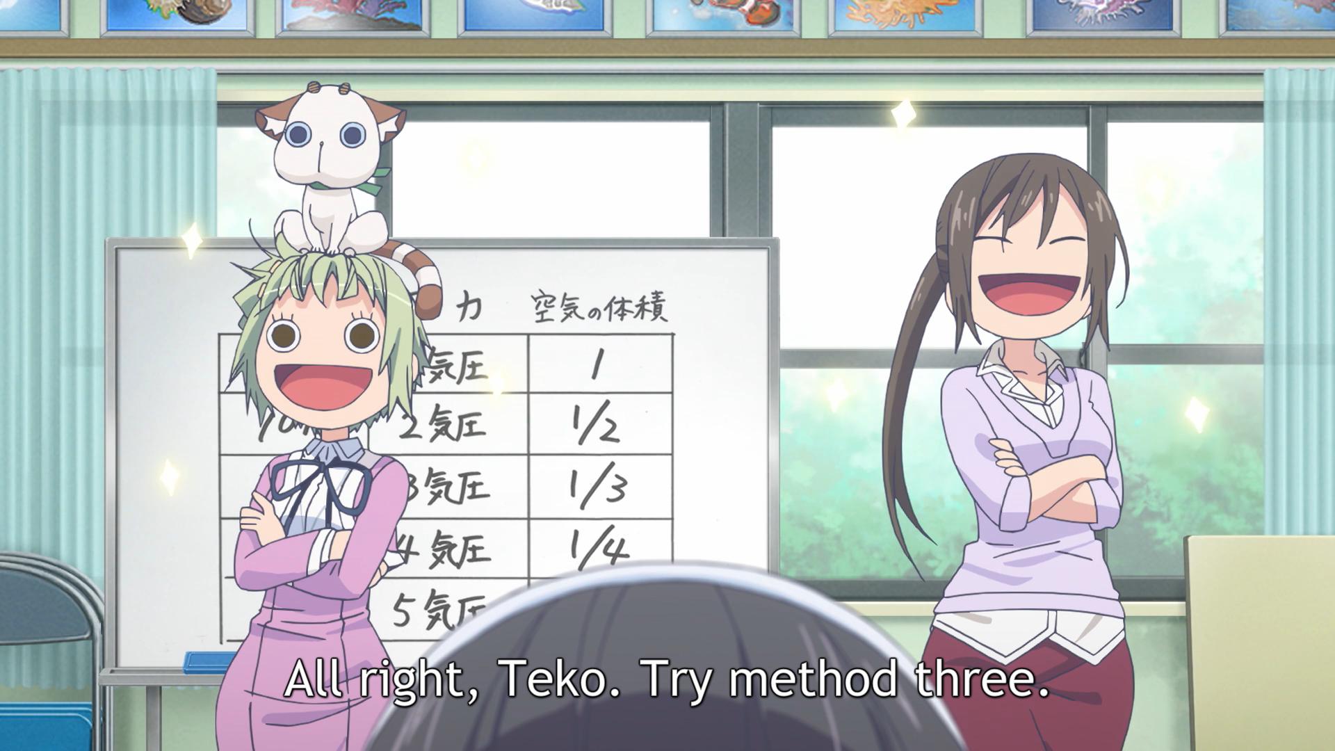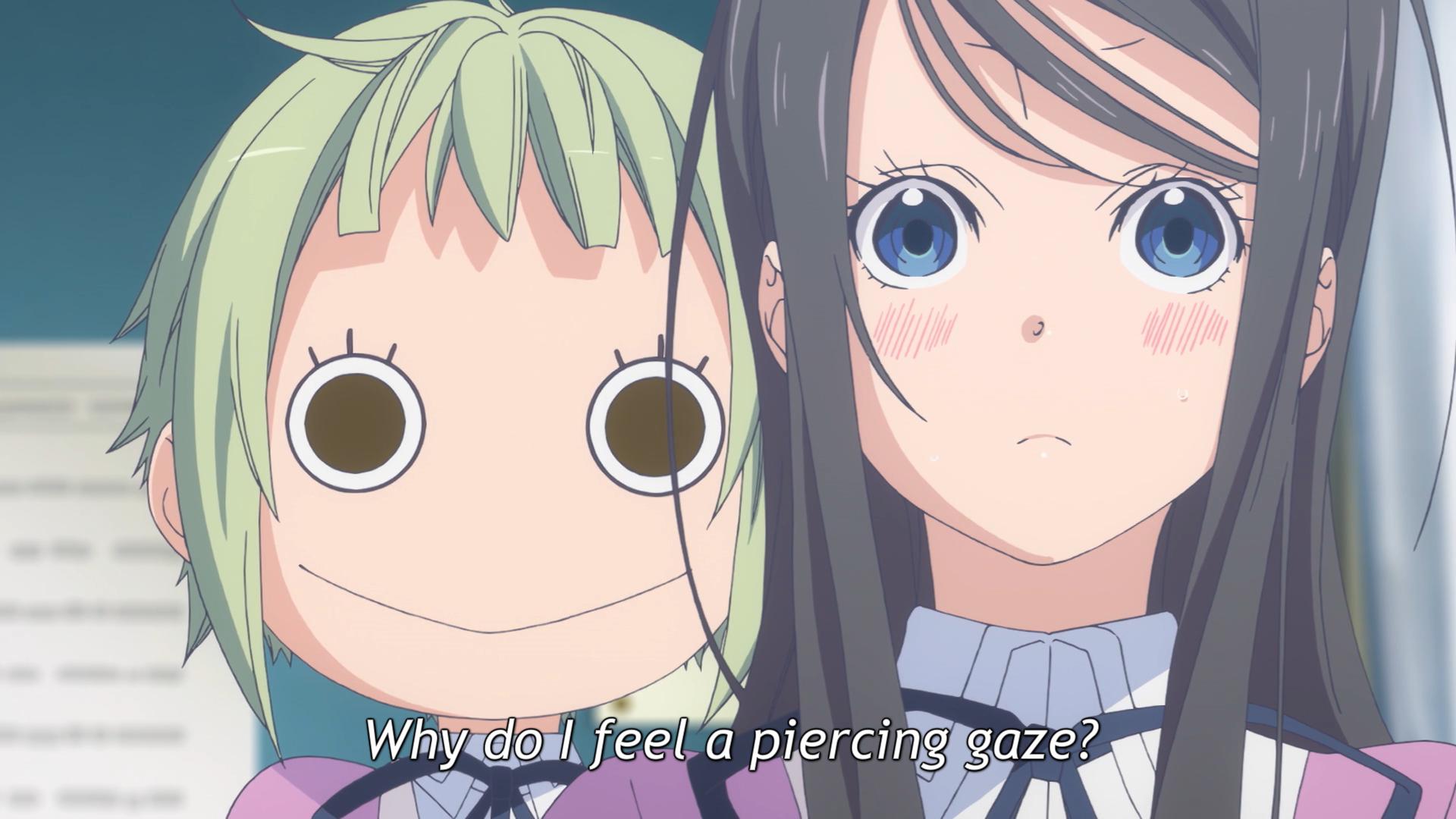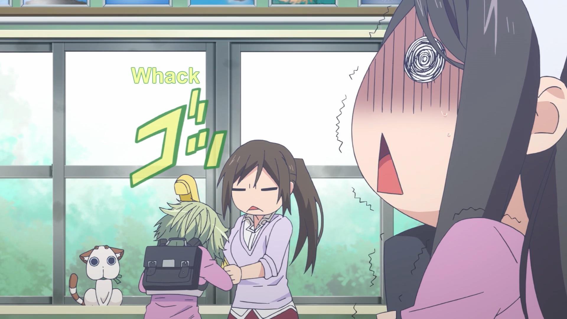 We see another variant here in Amanchu!, when Hikari assigns Futaba a nickname based somehow on her thin eyebrows. I’m like: Excuse me? You’d better tell her off when you grow some backbone, girl. Luckily, it’s not like a nickname this asinine has any chance of catching o-