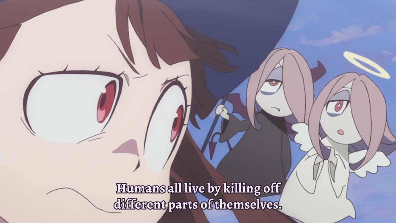 Akko and the audience meet numerous facets of Sucy’s subconscious – foremost among them: the classic shoulder-sized angel and devil aspects, complete with the now-familiar twist of their moral directions being somewhat relative.