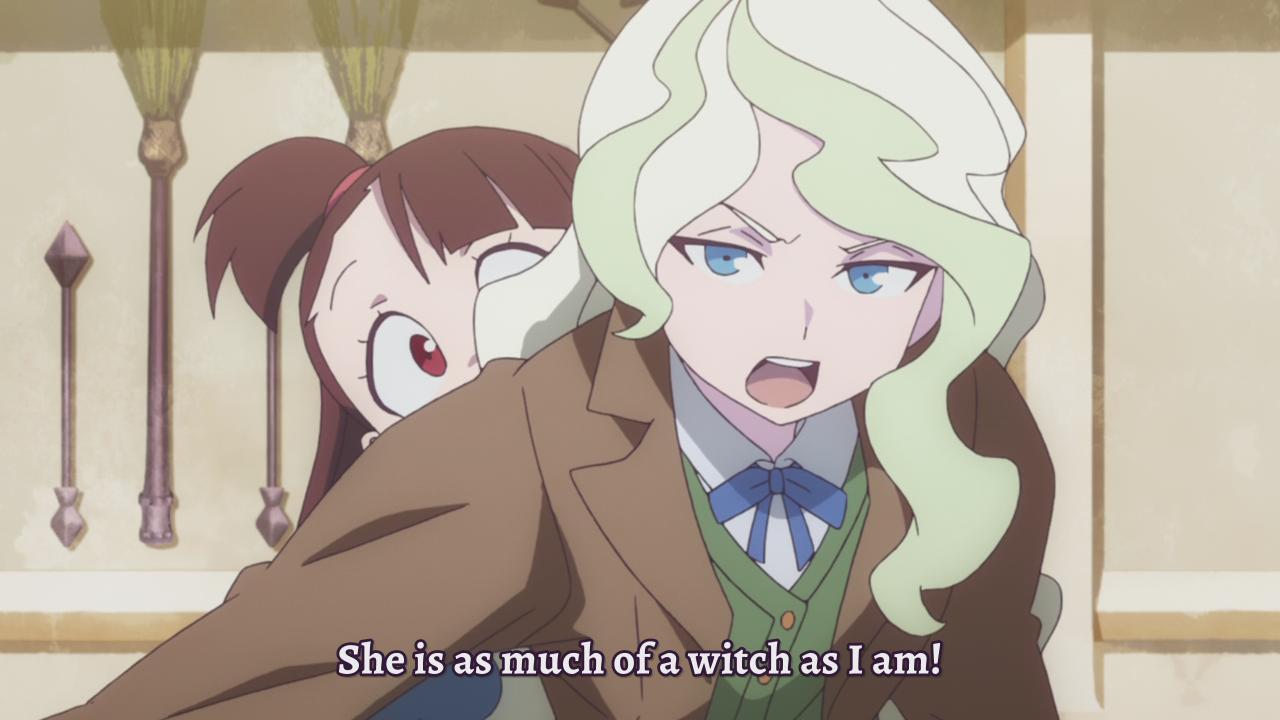 And so, when Daryl and her twins put Akko down, Diana steps in. Akko may be a half-wit who routinely makes poor decisions (including, from Diana’s current perspective, the decision to follow her back to her home), but she doesn’t deserve the kind of prejudiced insults poured on her by Diana’s extended family. She’s accomplished too much for that. Diana may feel powerless to direct to Akko the recognition she deserves at Luna Nova, or regretful for not trying harder, but in her own house, Diana will stand up for her bumbling comrade.
