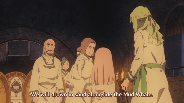 Having no confidence in mounting a successful resistance to a floating island full of emotionless warriors with metal armor and gunpowder weaponry – only to then be faced with an entire country’s worth (assuming that their erstwhile homeland subscribes to the Zapp Branigan school of warfare), the council of elders decides to straight-up sink the Mud Whale and quit while they’re ahead (and before they’re, you know, just heads). Predictably, many of the younger inhabitants of the Whale are not enthused by this decision. Suou is the first to find out, when he is promoted to Chieftain and immediately given the task of actually sinking the Whale – he refuses (before anyone explains how exactly they expect him to do it), and coaxes some potentially helpful gibberish out of the council’s oldest member before he is knocked out and carried away by the Captain.