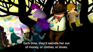 It’s nice to see Kyo making a genuine, if funny, effort to control his temper. As the most passionate one of the bunch, he’s the most upset at Tohru’s situation and feels responsible, though he still thinks she’s an idiot for always putting others before herself. This is where Momiji steps in with a story he heard in school about a foolish and selfless traveler who gave away everything to people who tricked her with sad stories.