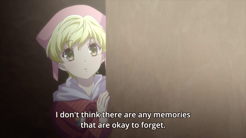 I was a little surprised at first at how the show was marrying two seemingly disparate story points (Momiji’s parents and Kyoko’s death anniversary) for this episode. However, when Momiji is monologuing about wanting to hold onto painful memories, while a flashback to Tohru crying over her mother’s corpse plays…it all came together beautifully.