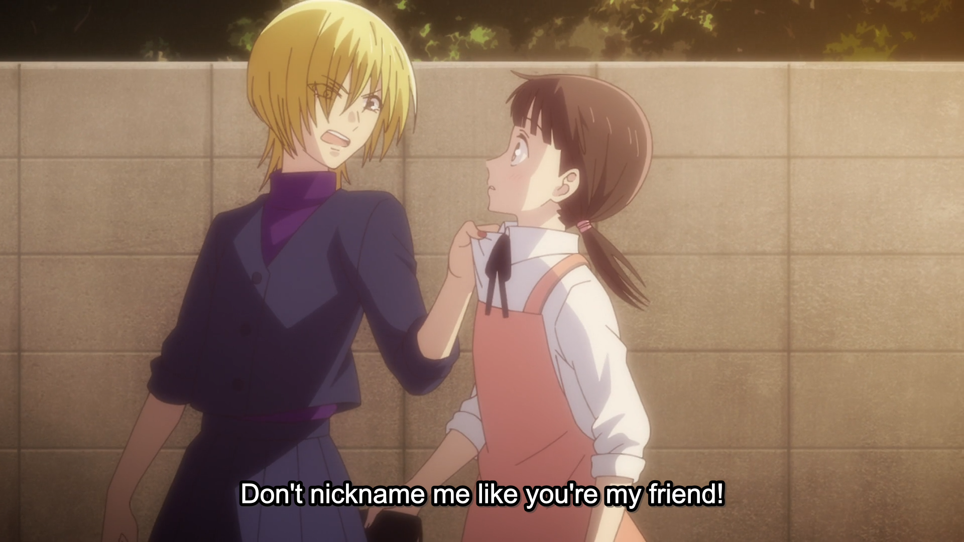 Arisa hatches a plot to upgrade Tohru’s swimwear from her middle-school-issued holdover, and hauls the Soma boys out to participate. The excursion transitions into a lunch out where Arisa tells Yuki and Kyo the story of how she and Tohru became friends, beginning years before, with a brief outline of her broken home and descent into gang activity. The conclusion is left for the next episode, as this one ends after Arisa recalls her devastating introduction to Kyoko, finding out that the woman she idolized for being the legendary gang leader known as the Crimson Butterfly had left the underworld to become the picture of domestic contentment.