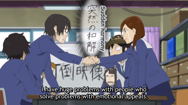 Watching Asakusa process her surroundings through a lens that has probably seen too much TV continues to be endearing as well, since her responses can vary from leading an escape from an underground leaf dump with borderline mechanical efficiency to having an existential crisis after discovering that her club-mates are working with another club.