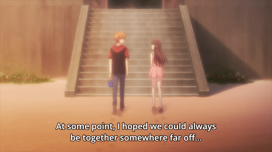 It’s was heartbreaking to watch the normally adorably ornery Kyo get abused this way, and reduced to a crumpled pile of pain. This episode really layers in tiers of suffering. First, it hurts to know that Kyo accepts the accusations thrown at him. Second, Akito reminds him of a “bet” (I put this in quotations because it’s more like Akito instigates a challenge and just decides that Kyo is now participating/will suffer the consequences upon losing) that will end in tragedy. Third is that Kyo reveals that he loves Tohru to us via monologue and then decides that he is unworthy of loving anyone.
