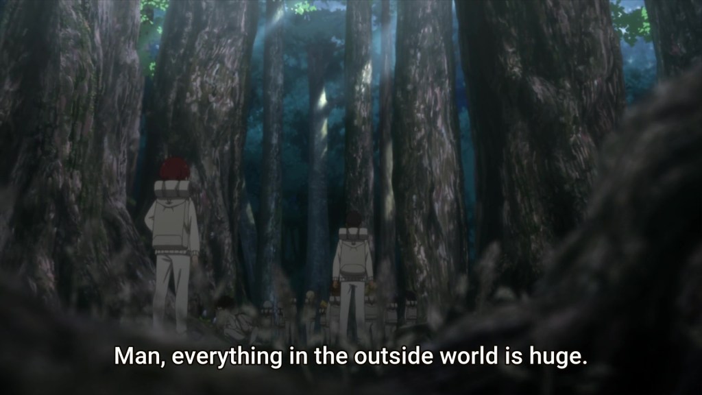 Season 2 of The Promised Neverland picks up almost right after Season 1 ended – the kids have escaped the farm and are on the run. The kids are barely able to get their bearings (using a handy holographic map) before being attacked by both whatever passes for wild animals now and an organized squad of demons. As the episode ends, Ray and Emma have been separated from the rest of the kids, but have been rescued by a different pair of demons, whom they trust not at all.