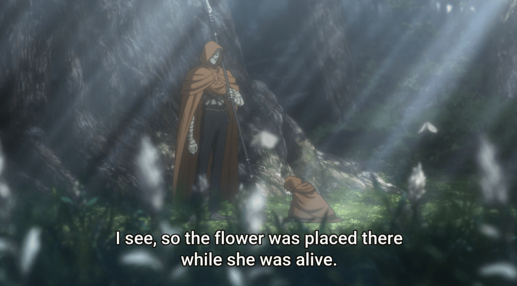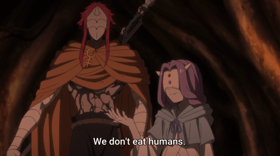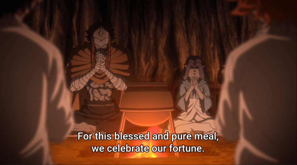 It’s important to me to draw attention to the reason Sonju and Mujika don’t eat people. It’s religious in nature, which is twisted irony considering they are…demons. Their devotion is made clear throughout the episode (they pray before every meal, and they have a deep respect for the forest that allows them to find sustenance). Their piety, along with their adorable big brother/sister portrayal humanizes them immensely, and I found myself sad that we may be parting ways with them soon. They are in the ED song so we can’t lose them this fast, can we?!