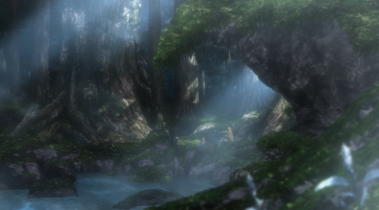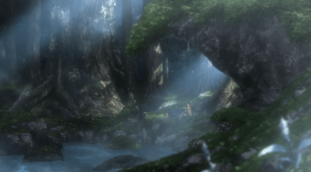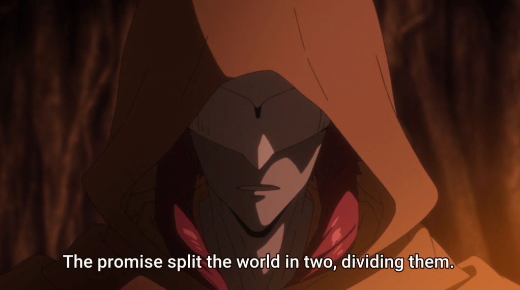 (B) The human world got…what?! It’s own world just to be left alone, free from demons preying upon them? Setting up a farm and effectively selling your own species seems like a massive price to pay. One that almost seems penance like. The whole “we live off the land and respect nature’s way like Native Americans” vibe from Sonju and Mujika add to my feelings here. Is this Somali and the Forest Spirit? Are we gearing up to showcase that humans are the real monsters here?