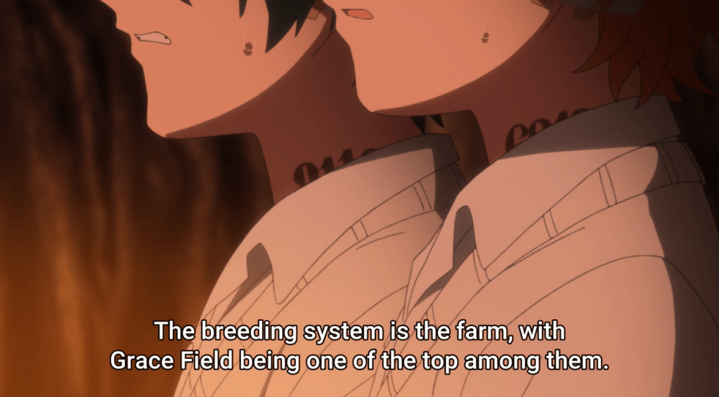Let’s talk about the major bomb drop here. There are two separate worlds. One of demons and one of humans, and guess which one our little family is stuck in? The kids of Grace Field have been duped by the limited literature they had to work with. This human farming has been going on for a thousand years. There also seems to be no way to get into the human world, but this (like many things Sonju “knows”) are merely hearsay. This leaves us the viewers starving for information and we only learn as the kids learn.