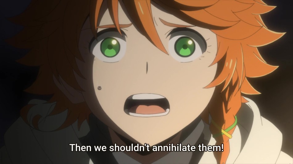Emma and Ray discuss Norman’s plan to exterminate demonkind with Norman. Norman first explains that Mujika’s blood has the power to let demons that consume it keep their human form and intelligence, and that any demon that gains this ability can themselves pass it to others. The demon ruling elite killed anyone with the blood, however, so they could control society using the supply of human meat. Mujika is a threat to Norman’s plans, and he wants her killed. Emma argues that she doesn’t want to kill Mujika, and further, does not want to exterminate demonkind. She wants to find a way to coexists, even if it is unlikely. After a lengthy argument, Norman grants Emma and Ray five days to find Mujika and return with her before he sets his plan in motion. After Emma and Ray leave, Norman talks to his team of fellow experimentees, and reveals that he’s using Emma to find and kill Mujika, and will continue his plan regardless. It also seems that all of the experimentees have only a short time to live due to a side effect of their time at the Lambda facility.