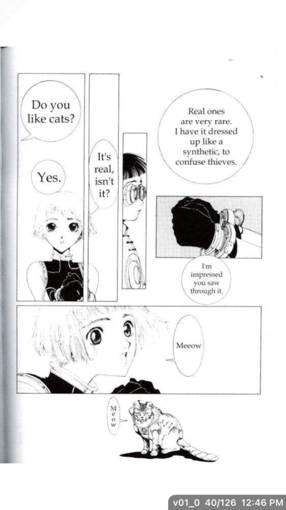 I won’t comment much on the plot because I haven’t gotten far (only 126 pages in) but suffice to say I love that the story drops you right in and kick starts the adventure as soon as possible. I don’t know the two warring sides (I’m unclear if they even matter) but I feel a connection to Kazuhiko and Sue. The first 120 pages or so really sell their loneliness. The fact that they can rely on each other, even a little bit is this gentle, soft feeling in a world that’s so mechanized and robotic. A flower amongst a metal city.