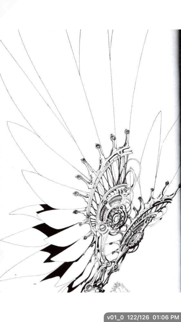 There’s also the matter of still shots of various objects. The video feed in the shot below could have been some throw-away design, but CLAMP chooses to give it this beautiful level of detail. That same beauty is in the iconic metal wings. At first glance you’d likely just fly by this shot, but seriously…take a look at the mechanical detail on these things. It’s incredible.