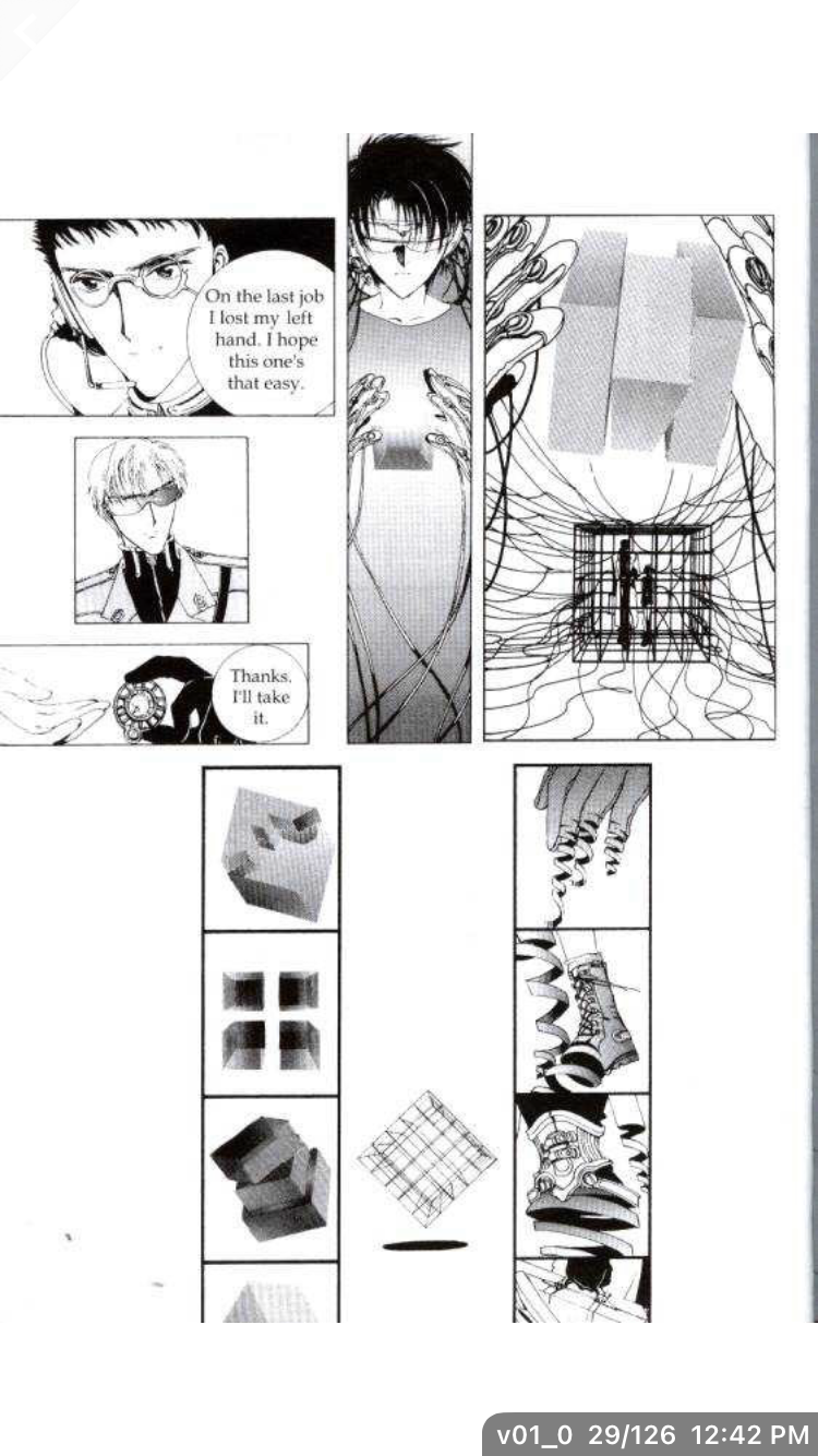 What struck me first and foremost about Clover was that there’s so much negative space in CLAMP’s artwork. In looking over some of my Tsubasa: RESERVoir CHRoNiCLE (everyone clap for me because I took the time to do the stupid capitalization) manga, it feels like the whole page gets taken up by backgrounds or action scenes. The panels can get very busy. Clover has a more ominous, mechanical, and lonely feel. Like the whole world is hard and devoid of natural elements like forests and lakes. A Brave New World meets Neuromancer type of deal.