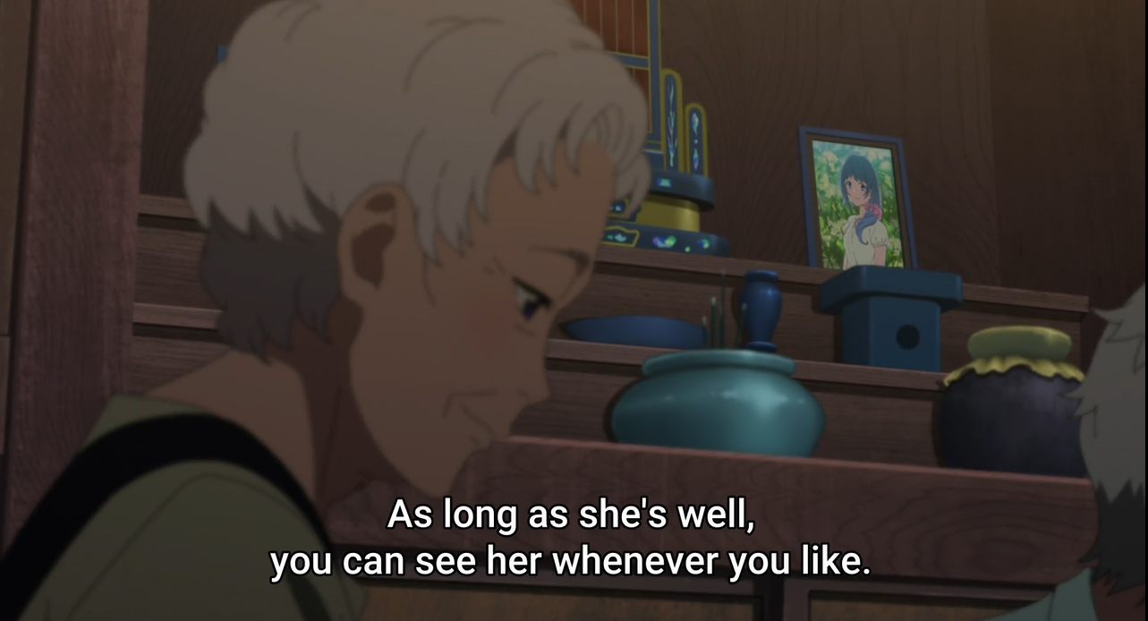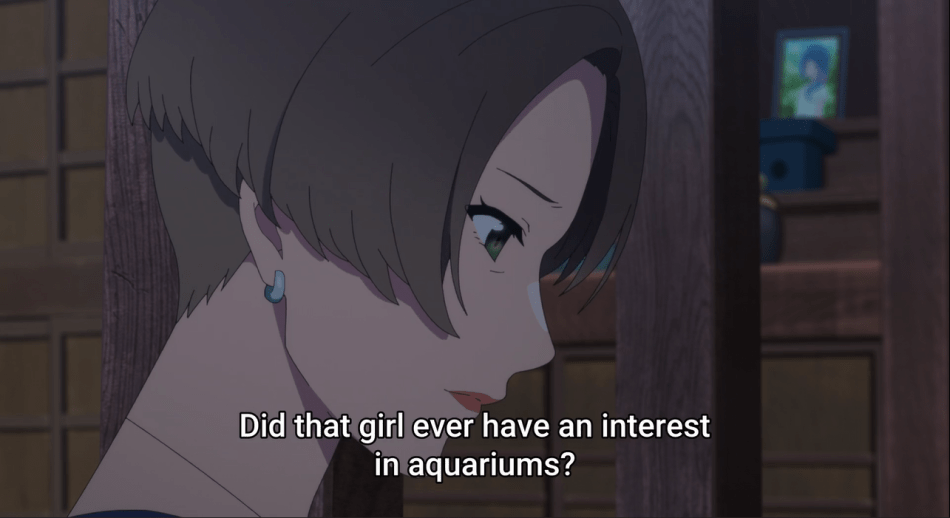 An important piece of dialogue dropped about letting your children go + a camera focus to a picture of Kukuru’s mother hints at important details to come. I am very curious how the baby book, Kukuru’s parent’s deaths (estrangement?!), and the aquarium will ultimately tie together. Something tells me there’s more to it then “I just want to preserve the place where my parents and I used to spend time together”.