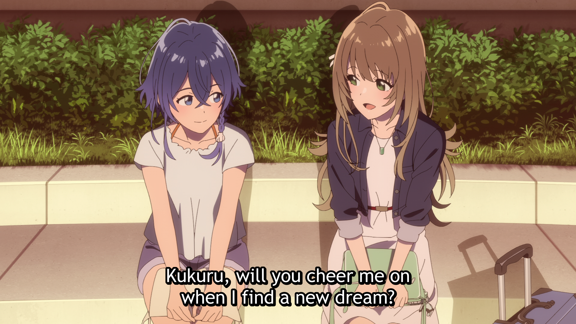 Point of interest: I feel like the primary twist that I didn’t see coming from my last writeup is that the show is going to go on for an entire additional season, which, as you may imagine, requires a significantly different kind of overall pacing than it would have if it were just the one. My first thought when I learned this was that the show might lean all the way into the role-reversal and that the entire second half of the show would be about Fuuka’s acting career, but that would be a pretty risky bait-&-switch. At any rate, with the girls going back to school, we’re pretty much guaranteed to get a time skip (much like A Lull in the Sea, if memory serves, which shares a hefty amount of staff with Aquatope), the question at this point is really just “How long?”.
