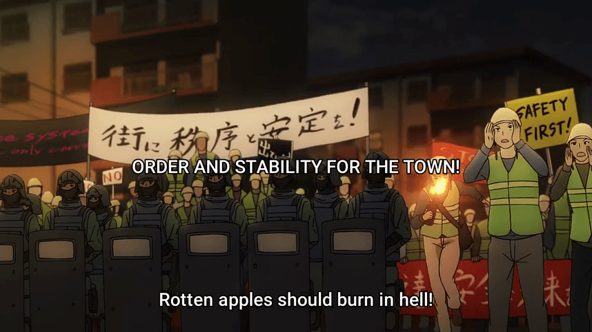 There’s a part where the supporters of the KANAE system are throwing Molotov cocktails at the poor, because any of last episode’s “we’ll turn the poor into felons so they can’t vote” subtlety is already long gone.