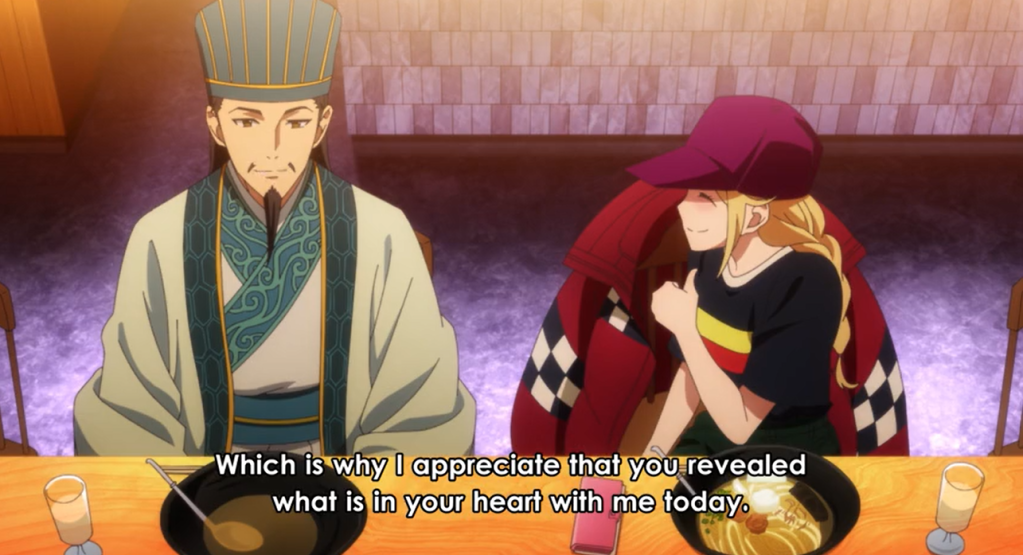 The touching sequence of Eiko opening up to Kongming was a lovely added bonus here. Her backstory in Episode 1 seemed a little…intense for a show that’s mostly full of fluff. Losing the only person in her life that supported her music and suddenly having her passion be shunned could definitely drive a person to a dark place. It was heartwarming to see Kongming encouraging her to be more confident and praising her new song.