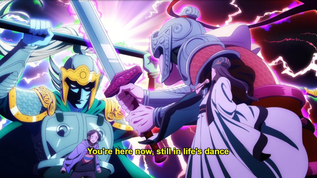 The rap battle also evolves visually as it progresses, as Kongming and Kabetaijin appear to embody heroes of the Three Kingdoms (at least in Kobayashi’s eyes). It’s a fun flourish, though as some have pointed out, it feels a little stiff at times. It would’ve been nice to see the animators really up their game for such a big sequence, but here’s hoping that they’ve saved those resources for the climax of the show.
