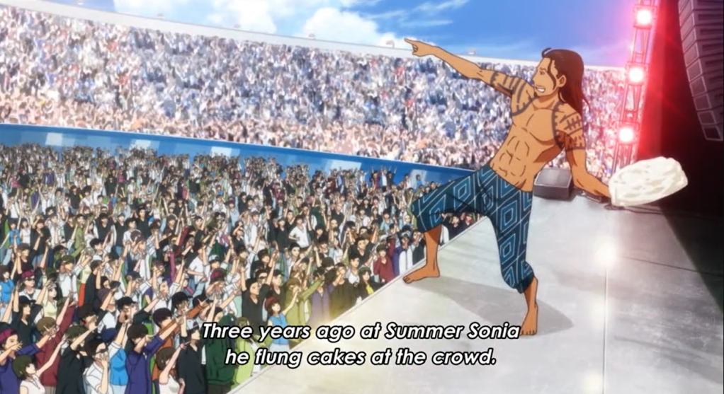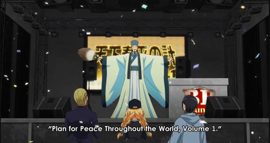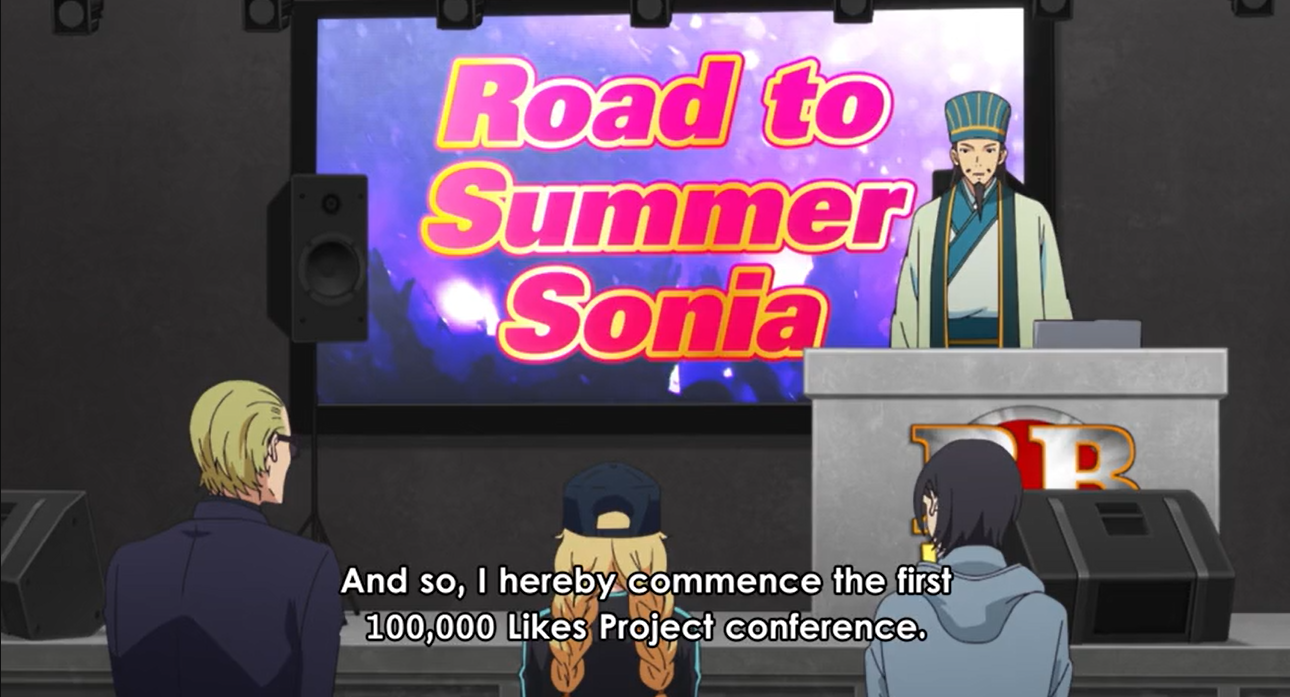 Kongming showcases some stats regarding the rival groups that are vying for the Summer Sonia slot. The team to watch out for is Azalea, whose lead singer is incredibly talented. To come out on top, Kongming instigates Operation: Plan for Peace Throughout the World. Everyone has their missions now. First things first though, Eiko needs to polish up her new song and Kabetaijin needs to defeat his longtime rival Sekitoba in a rap battle rematch. How will our duo fare in their respective tasks?