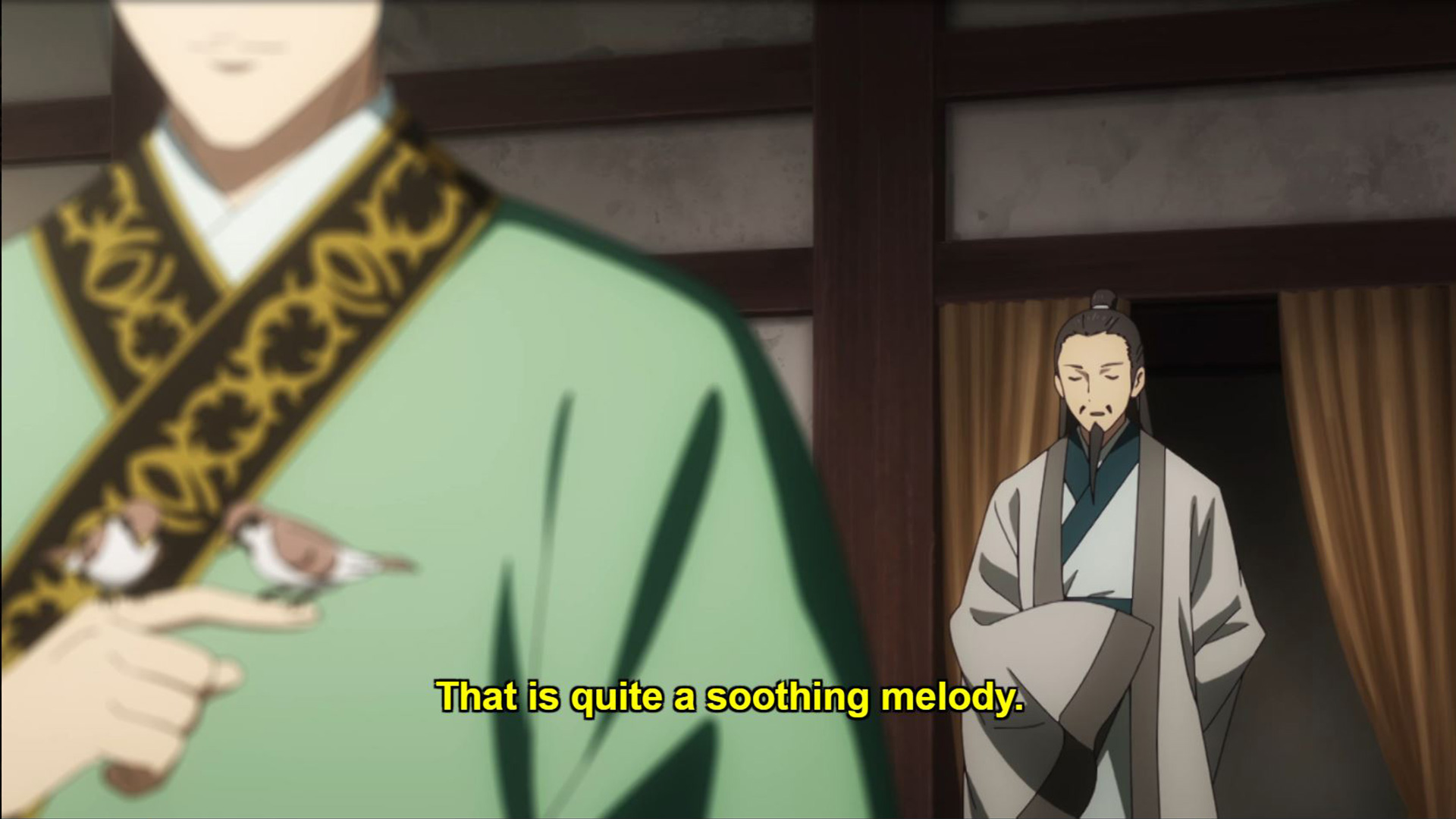 There’s an entertaining cut just as Eiko starts singing to keep us from hearing the entire performance before the big finale that thrusts Kongming briefly back into his past memories. He recalls his meeting with Liu Bei, and how his concern for the people under his rule moved him, much like Eiko’s music moves him now. It’s a touching scene, made more poignant by a complete lack of music until we hear Liu Bei humming a lovely melody. I really have to credit the artists and performers for making this moment feel weighty and meaningful. Even though we’ve seen so little of Kongming’s life, the impact of these little scenes always impresses me.