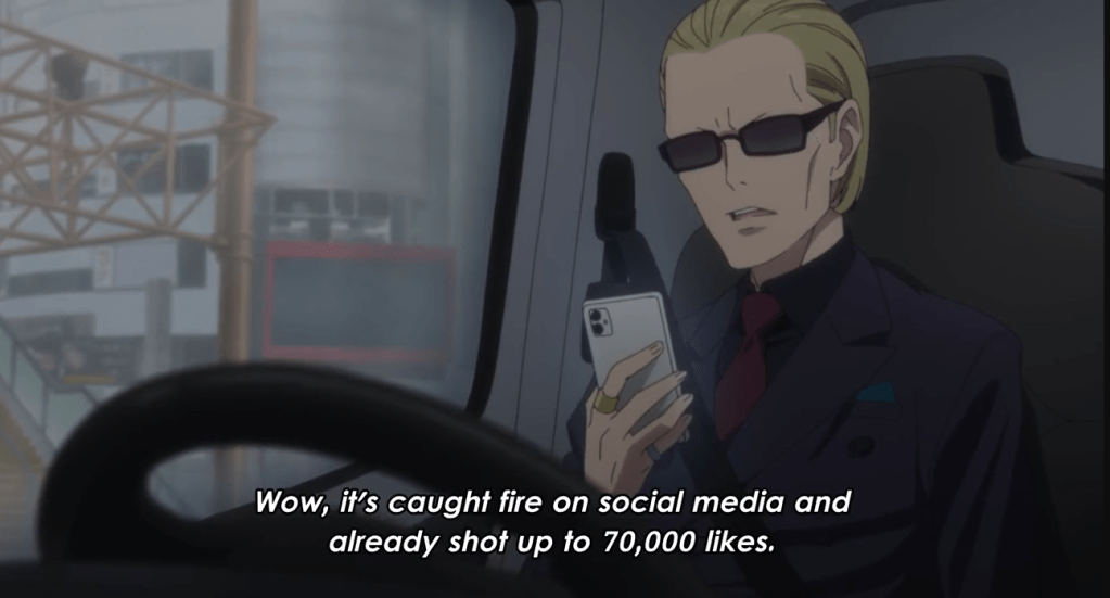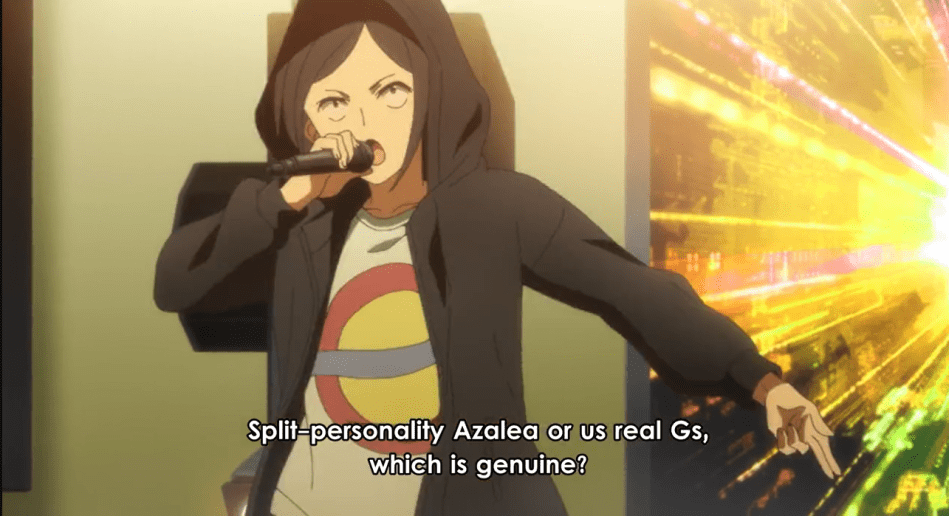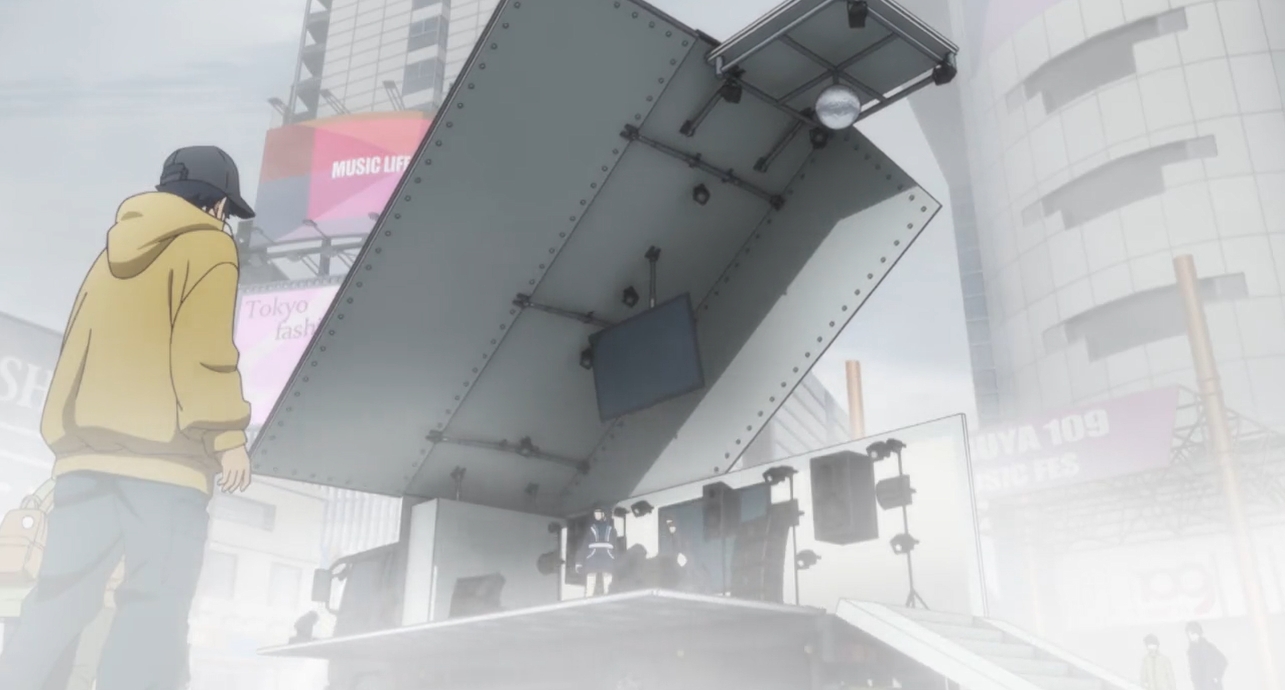 Third, how in the triple hell did Kongming predict the exact location of the secret concert? I feel like this should have given Azalea the edge. At first I thought maybe the concert was scheduled elsewhere and Kongming lured Azalea to Shibuya 109 with his ruse. Upon rewatching…nope, he somehow knew that out of all the places in Shibuya, THIS SPOT was where everything was going to happen. Now…I pulled a Brendan and went back to Episode 07 for research. Kongming gives Eiko a Public Road Usage form for the Shibuya Scramble near Hachiko. Shibuya 109 is a super popular fashion store on the scramble. Metaphorically it’s pure poetry that Eiko and Nanami have to duke it out in the place that they sang acoustic street music together and forged a beautiful friendship. Predictability wise though…I guess Kongming could have known the largest crowd possible would require the Shibuya Scramble, but stiiiillll. It would have been nice for there to have been some detective work to confirm this even if Kongming had a hunch.