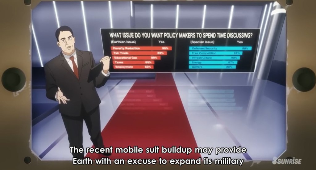 2.) The news clip shown early in the episode has a survey wherein it ranks the issues that Earth and the Spacians feel lawmakers need to discuss. If you pause and look, majority of Earth’s citizens are concerned about things like Poverty Reduction, and the Education Gap. The Spacian’s on the other hand care about Defense/Security and Infrastructure. In this single image you get a sense of the political climate of these two nations and what types of societies exist there. I thought that was an amazing way to do some quick worldbuilding.