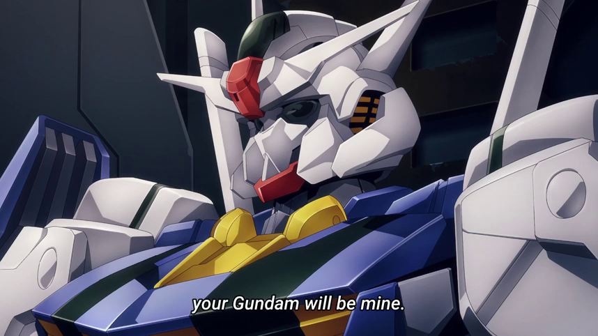 Peil Technologies is interested in Suletta’s mech Aerial, as they can’t figure out how it’s avoiding the normal drawbacks of Gundams. They send Elan, who it turns out is a manufactured Gundam pilot, to investigate directly. First he convinces Suletta to let him pilot Aerial, but when that doesn’t yield enough information he challenges Guel to a duel with his stake being a new duel against Suletta. Elan easily defeats Guel and reveals that his mech, Pharact, is a Gundam. The stake if he wins against Suletta – ownership of Aerial.