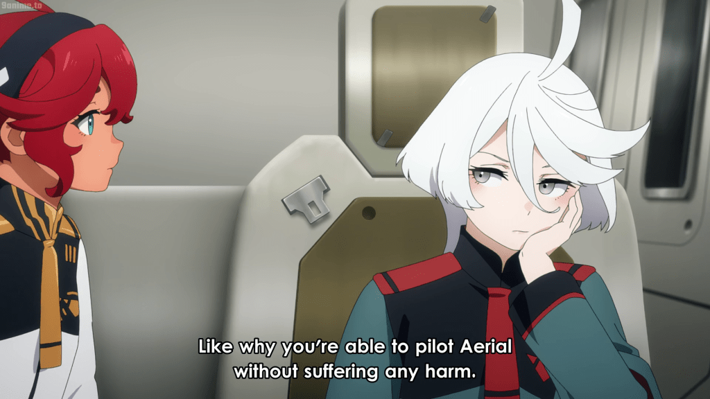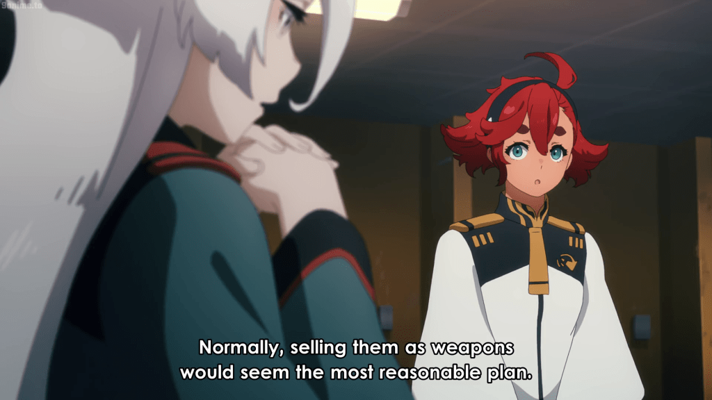 I guess it’s worth touching upon that Nina is very clearly a Benedict Arnold and is going to betray the Earthian group because Shaddiq has influence over her somehow. I’m sure all will be forgiven quickly because Suletta’s power is “Naiveté Friendship Beam”. Shaddiq’s story could be interesting. Being a war orphan who got adopted into wealth should make for a conflicted character, but I’m not holding my breath that anything of value will come out of him.