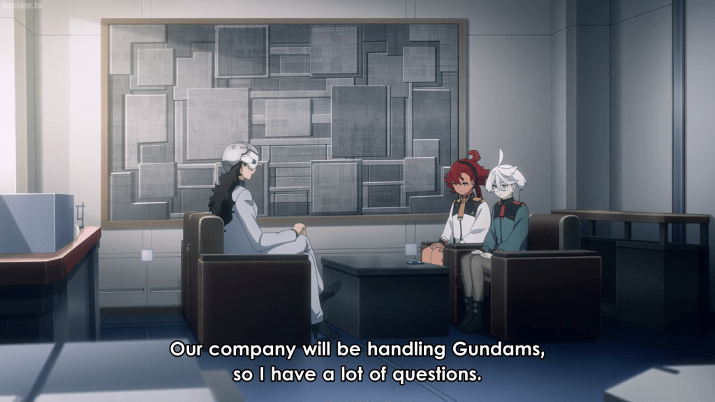Miorine brings together the Earthians and Suletta to decide what the goal of the their new company is. The easiest decision would be to research/manufacture Gundams for war purposes but that doesn’t sit right with most of the group. Meanwhile, Shaddiq sets his sights on Miorine herself, to try and get in on her new company venture.
