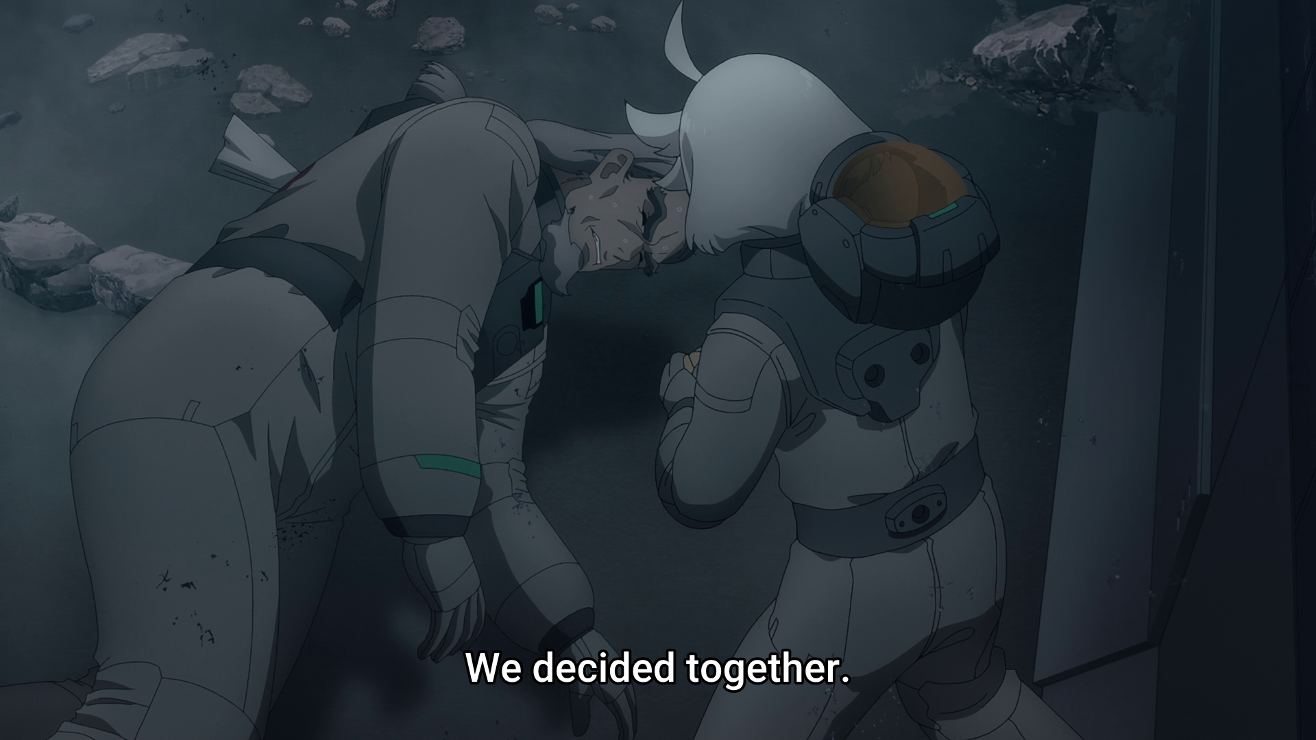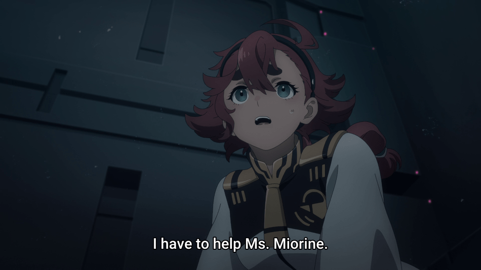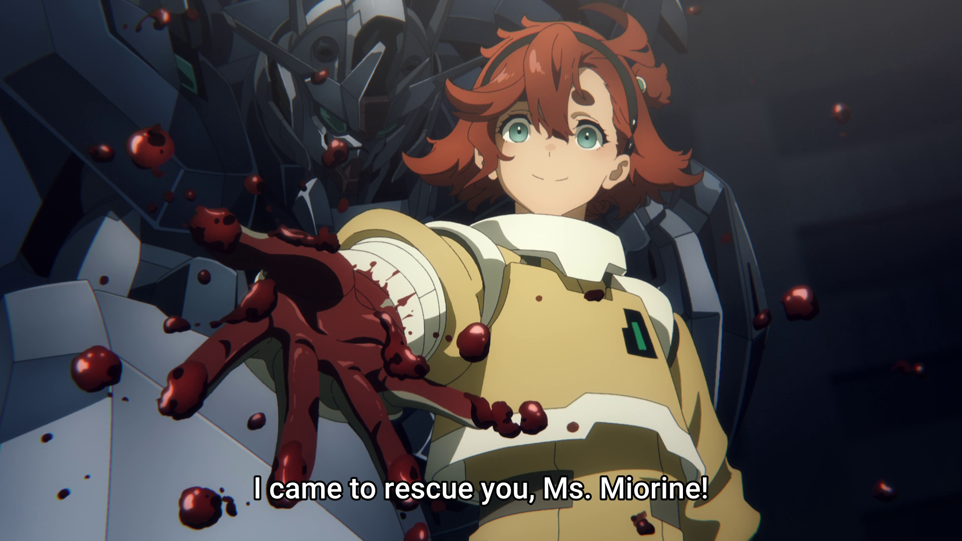 in the span of this episode. I understand you wanted a cliffhanger for the second season in April, but if you want to fire a Chekhov’s Gun it’s imperative that you…LOAD THE GUN. I am as shocked as the writers wanted me to be that Suletta just smashed a man into bloody pancake batter, but not for the right reasons. The actions she takes here and her reaction to the aftermath just feel so out of left field for this Fluffy Puff Marshmallow of a main character as to be almost laughable.
