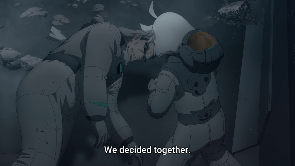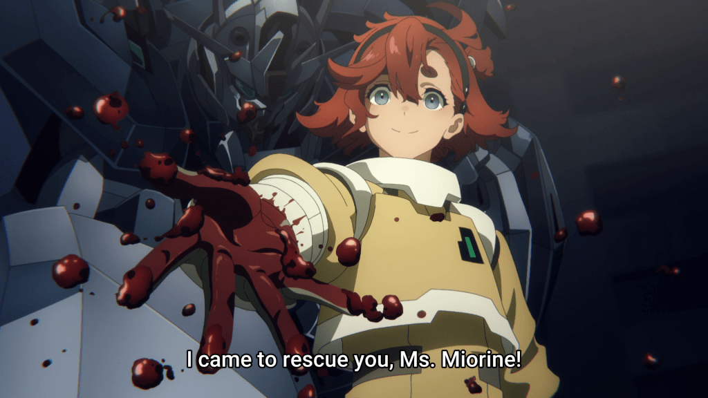 This is ultimately what I’m looking for Gundam to be. A strong setup with payoff to conflict that is presented in the story. The battles are well executed while they last, and there’s genuine tension with sequences like Miorine desperately trying to move her father to safety, and Suletta physically shell shocked at the sight of dead bodies when her mother saves her. There’s real stakes and consequences here for all the characters in play. Unlike the prologue which had a whole lot of murder without the strongest setup to back it up, there’s a sense of justice here that has been teased the entire show.