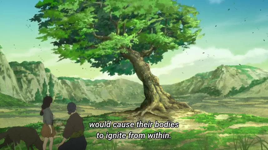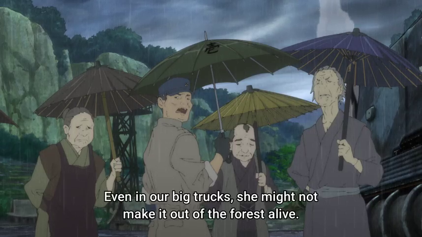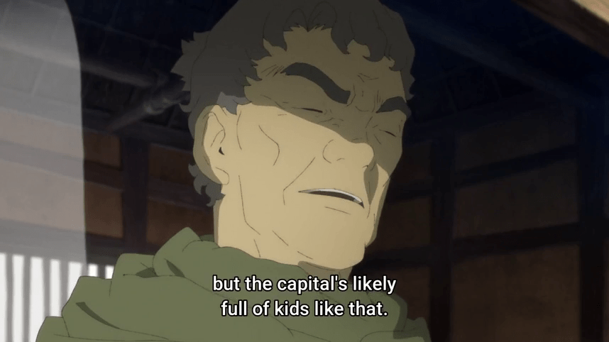 The premise, that the result of some great war is that humanity now lives in fear of fire, makes for a very interesting setting. Due to the fire fiend blood effectively replacing fire for most applications, it isn’t as great a change as you might expect from the initial read, but the show has done a good job of showing and telling the effects. The fiend blood is dangerous to obtain, and so access to it is much more limited. A remote village like Touko’s still has enough for each family to cook, have limited light, and use for small-scale manufacturing (this village makes fancy paper), but that’s about it.