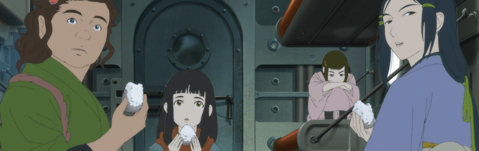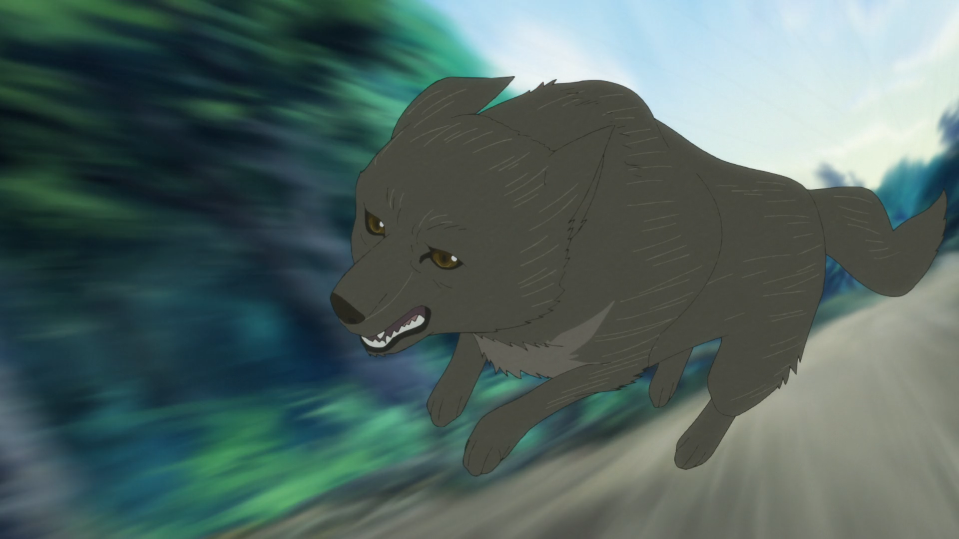 Mamoru Oshii (of Ghost in the Shell fame) and director Junji Nishimura have gotten together again to make a work that I find very reminiscent – stylistically – of their 2004 collaboration, the angular Windy Tales. Thematically, of course, the two are quite different: Windy Tales is largely episodic, and infuses the calm mundanity of modern Japanese life with just a touch of the supernatural, whereas The Fire Hunter establishes a strong narrative (or two) in a harsh world with humanity once again struggling to maintain civilization by carving out our own niche amidst the mighty forces of nature. Few anime, however, join these two in being so deliberately paced – heavy with dialogue spoken over nearby establishing shots, or slow pans of frames drawn in full background detail (see above), or views of the characters themselves quietly doing something or going somewhere either before or after the conversation. This can make both shows a little difficult to parse, but they offer unusually meditative experiences for dedicated viewers, and I’m glad to see the like again.