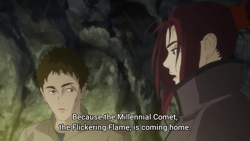 Last episode we heard about the Flickering Flame, a man-made comet that will never return – Koushi had to learn about it with a special pass to the central archive, where the information was in a super-special small room where the most esoteric and precious knowledge is gathered. This episode Akira casually mentions the Flickering Flame like every fire hunter knows about it.