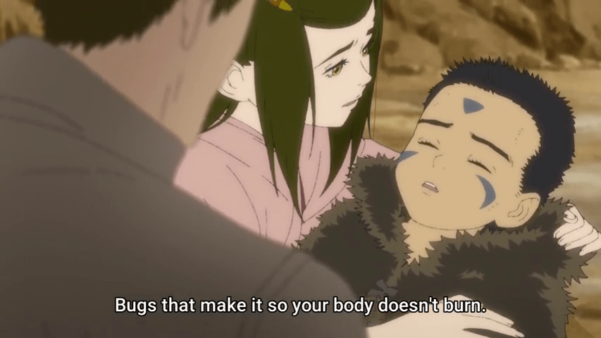 Touko and company are briefly attacked by a Spider clan member, but he is driven off by Akira, a roaming fire hunter, before making it to safety in the village she works for. She agrees to accompany Touko and the other train wreck survivors to the capital in exchange for payment in Touko’s muku paper. Along the way they pick up a Spider clan child left behind because he is immune to the bite of an insect that grants the Spiders protection against dying of natural fire. They come across the site of a massacre, where the Spider clan has used natural fire and apparent control of fire fiends to wipe out a large group of fire hunters. As a large group of fiends appears, the team flees onto a boat, but not before Shouzou is badly wounded. Touko wields the fire hunter’s sickle and kills a fire fiend before it can harm Kaho. Meanwhile in the capital, at a party on the estate, Koushi is met by an experienced fire hunter who wants to talk about skyfire.
