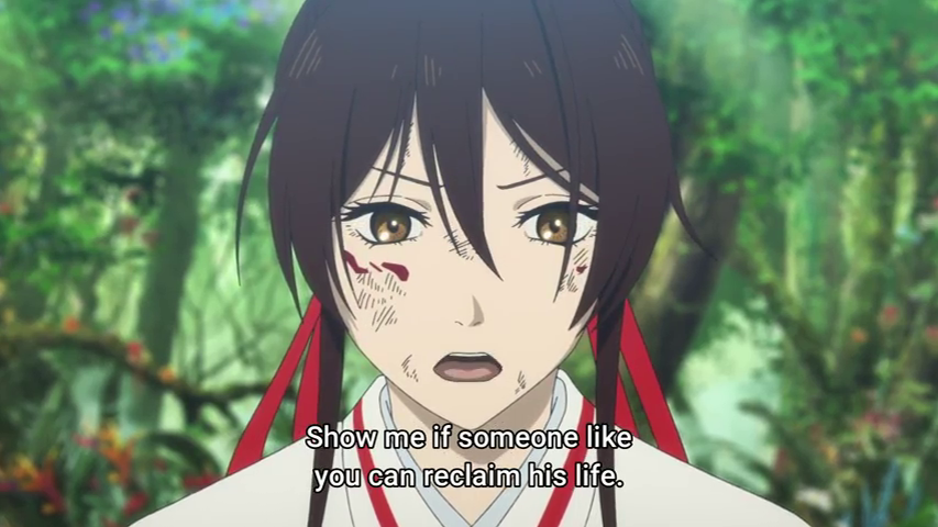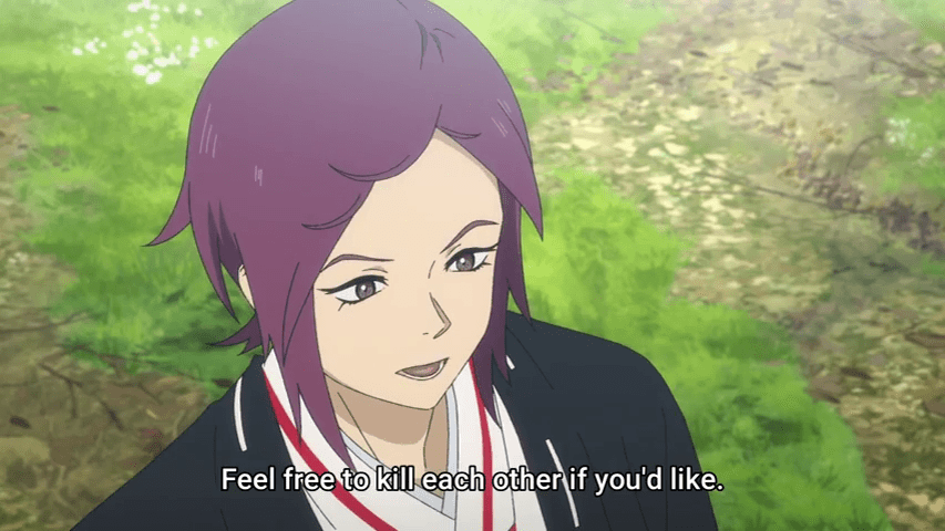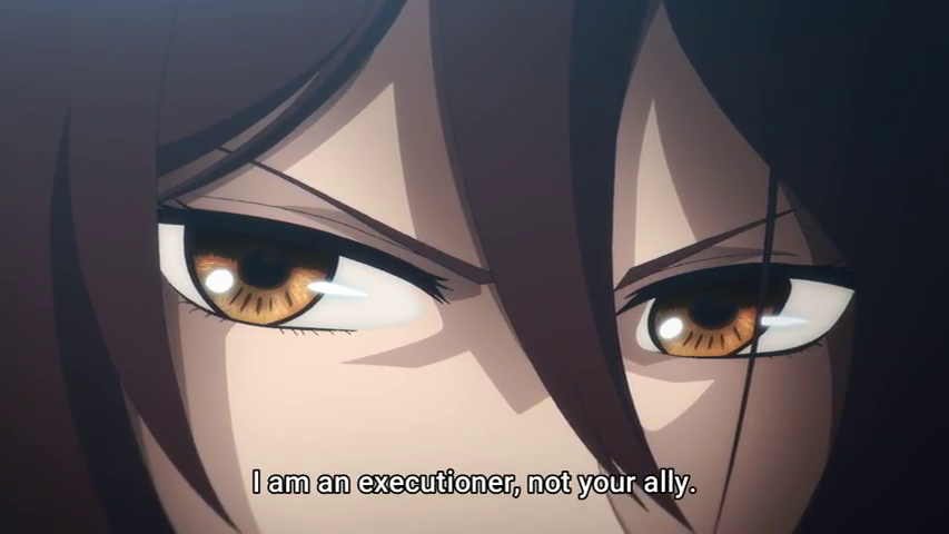 My second big problem is with character motivations and behaviors. Clearly, given the above, the only characters that will matter for any length of time are Gabimaru and Sagiri, and they presumably will receive all of the character growth. Yet within the span of about an hour, Sagiri goes from this: