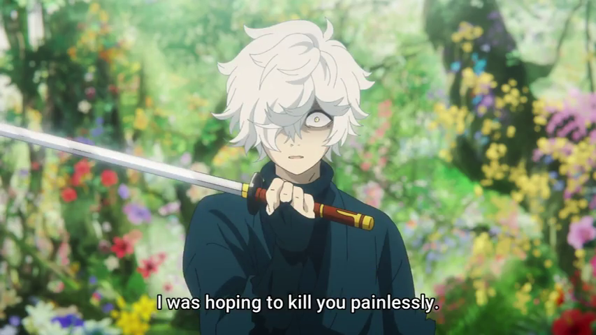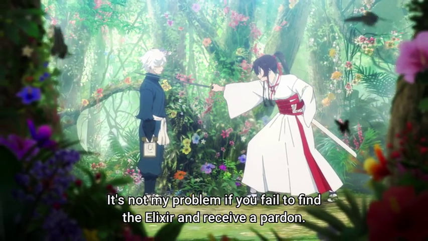 There’s clearly a lot of money behind Jigokuraku – the animation and backgrounds all look great – but there’s just as clearly not a lot of writing talent. While the whole episode is a mess of bad pacing, childish edgy posturing between characters, and casual gore, there are two things I want to call out in detail.