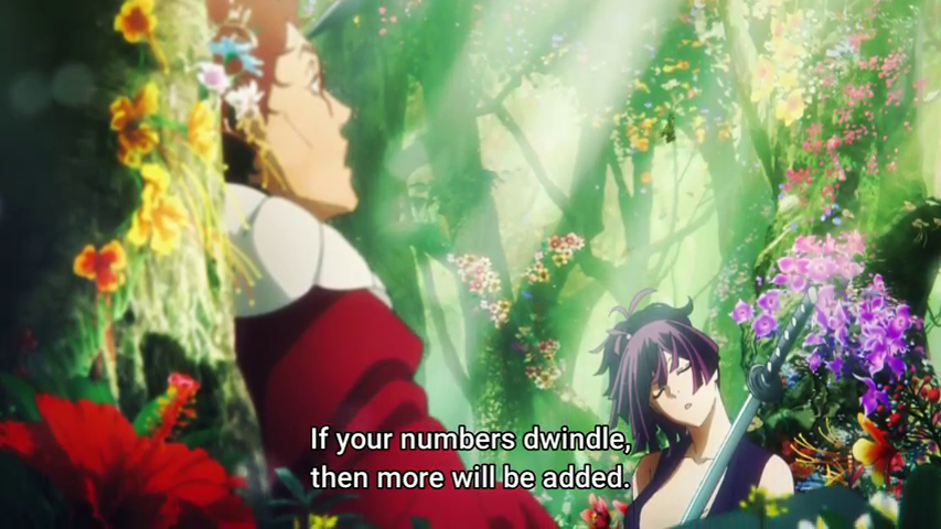 I know I was complaining that nothing was happening, and I also know that we’ve gotta get this team established, but this is ridiculous. It also simply doesn’t hold much water. The show is telling us that memories and emotions from his wife are staying his hand… but why? What kind of strong emotional bond has he formed with Sagiri that prevents him from killing her, when he clearly still has the ability to kill, and kill easily (he did just finish impaling some monk guy with about a hundred of his own swords)? I’m just not buying it.