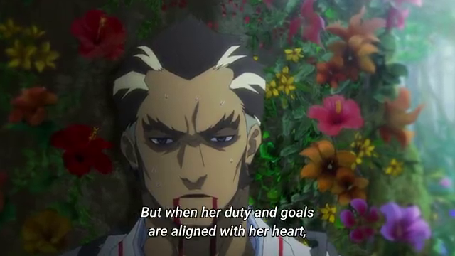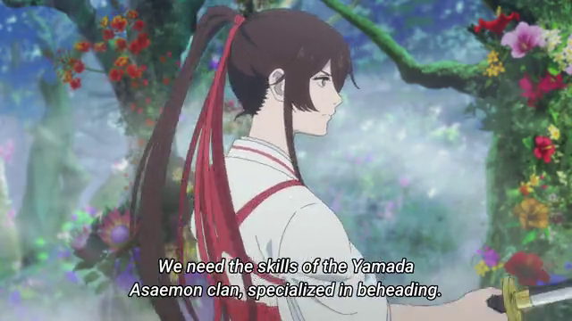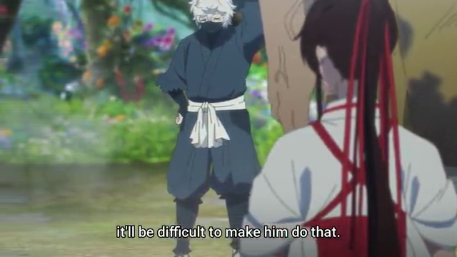 My personal favorite was this moment, where Sagiri and Gabimaru stand around talking about the ongoing fight, with their supposedly fast-moving, deadly opponent standing stock still in between them.