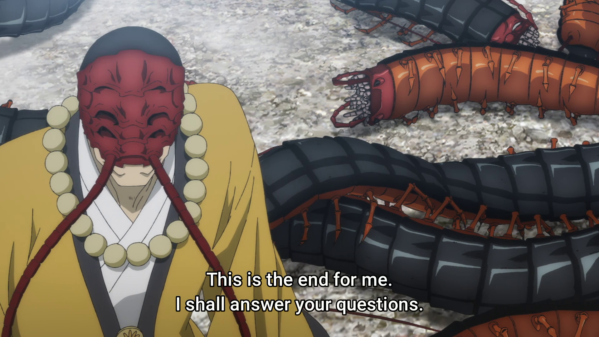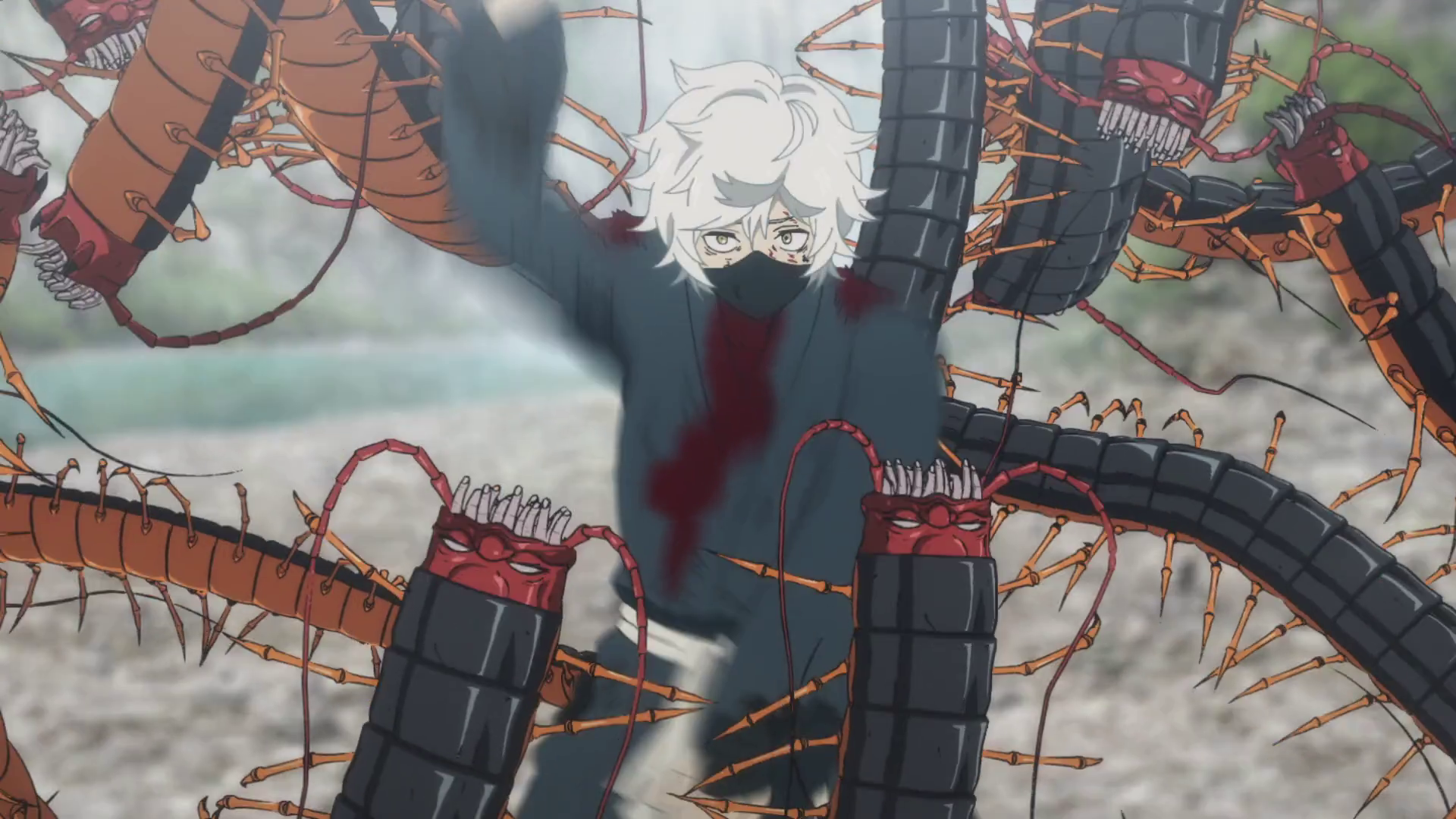Later, Gabimaru is fighting off a bunch of bugs, and he stands stock still while his arms wiggle around him, punching and fending off his attackers. I think it’s supposed to look like he’s cool and unfazed, but it just looks ridiculous instead, like they forgot to animate his body.
