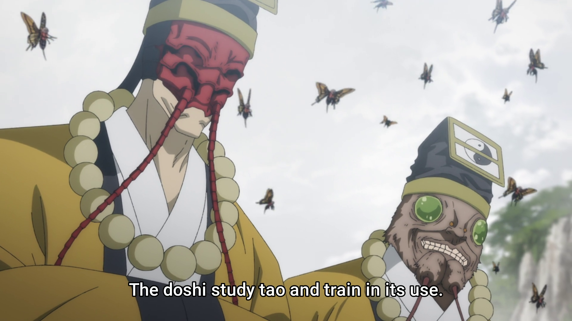 After powering up, Gabimaru easily pushes back the Soshin, but after a minute of fight, he asks them some more questions and, no joke, the baddie goes “Yeah, all right. Sit down while I read you part 3 of my novel on tao usage.”